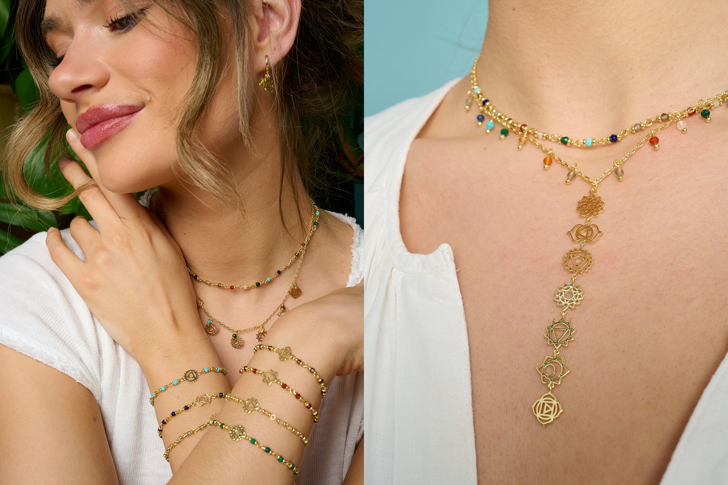 There are seven principal chakras and each one has its own unique symbol and colour – Crown, Third Eye, Throat, Heart, Solar Plexus, Sacral and Root. Our range of beautiful bracelets feature a gold or silver plated filigree chakra energy symbol and use semi-precious gemstones that correspond to the chakra colours.
